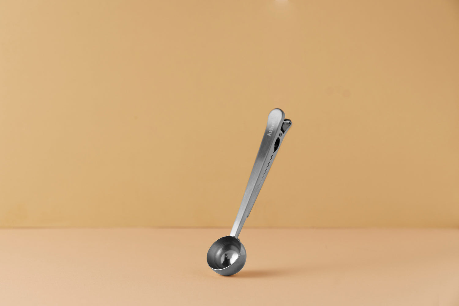 The innovative multifunctional design of a coffee bean scoop. It works as a measurement scoop and as a clip to seal your coffee bag.